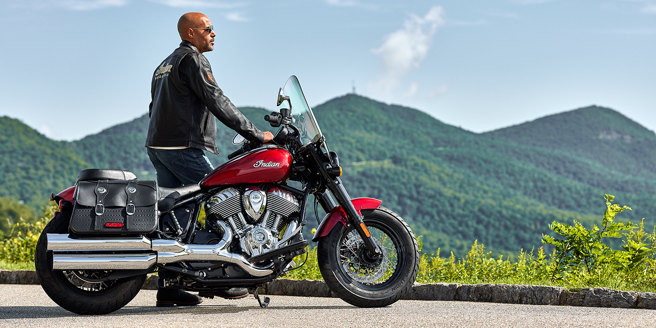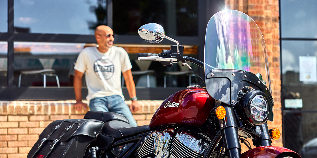 Premium-Chrom-Oberflächen, Gabelabdeckungen, Drahtspeichenräder, eine große Scheinwerfermaske und der berühmte Indian Motorcycle Schriftzug auf dem Tank.