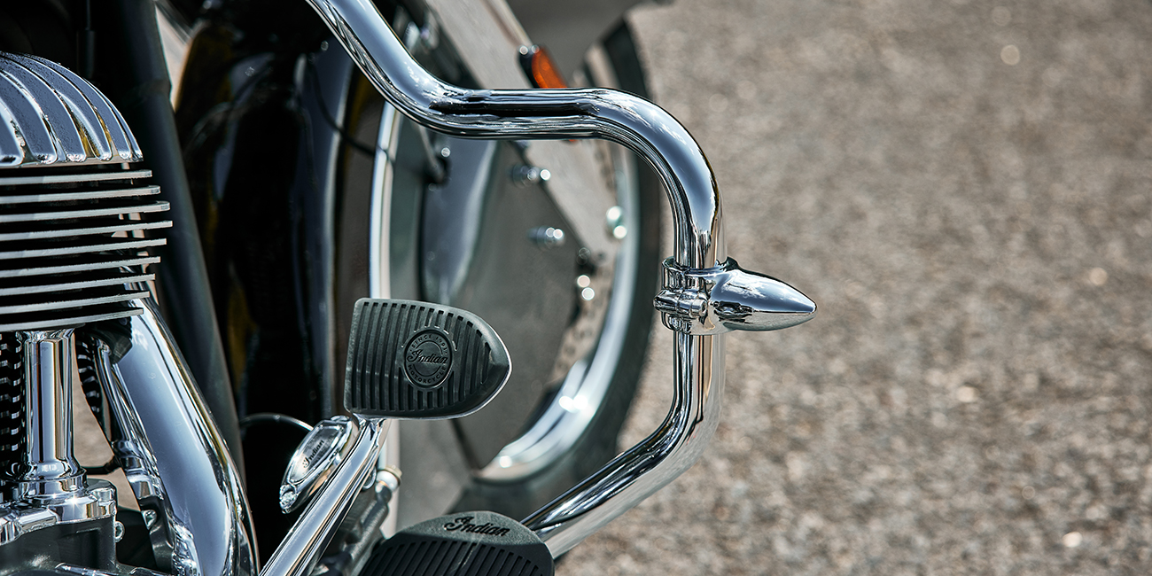 Windschutzscheibe mit Schnelllösefunktion, Sitz aus Vinyl, fernverschliessbare Satteltaschen, Sturzbügel, Reifendruckkontrolle, ABS, Tempomat, schlüssellose Zündung, Indian® Schriftzug auf dem Tank Badge